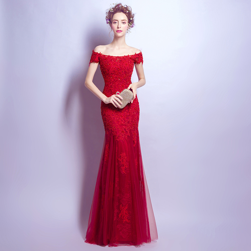 • 天使嫁衣酒红色蕾丝钉珠一字肩鱼尾婚纱礼服新娘结婚敬酒服277