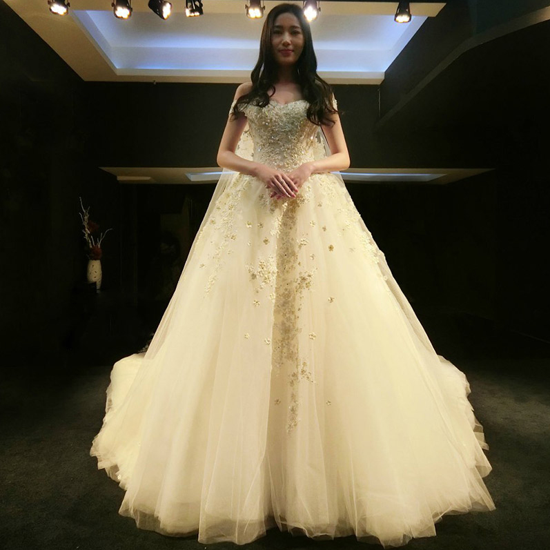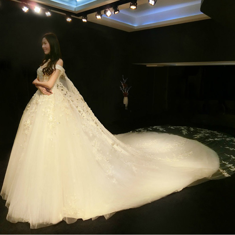 1.5米大拖尾!婚纱礼服新娘2017新款春季奢华一字肩婚纱