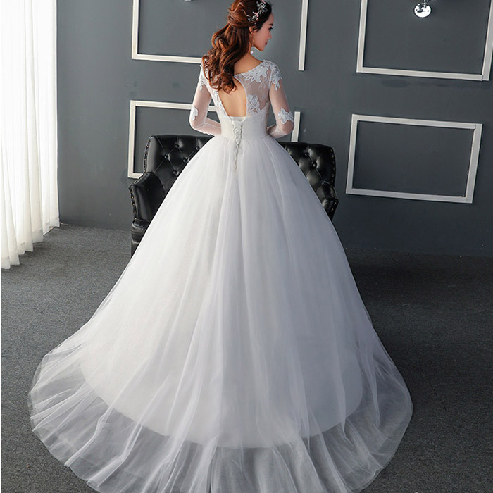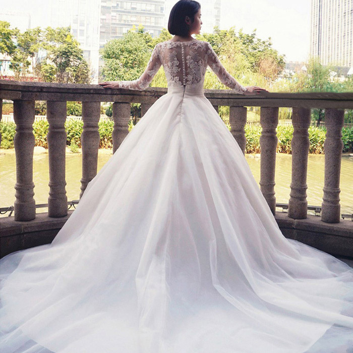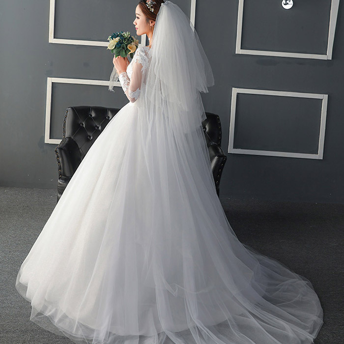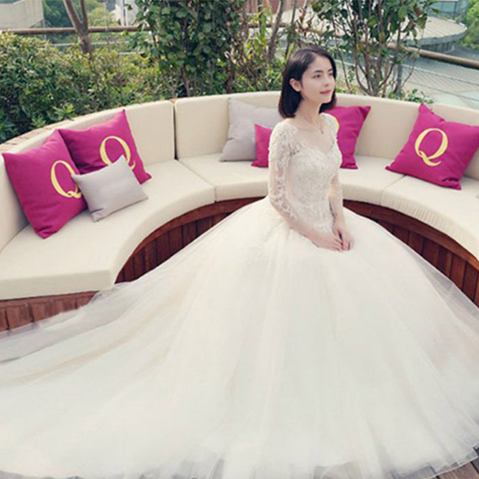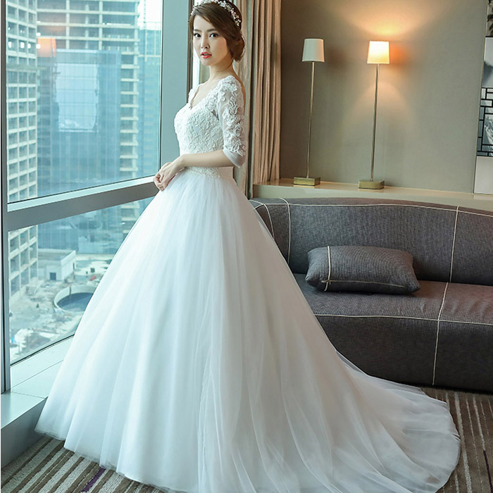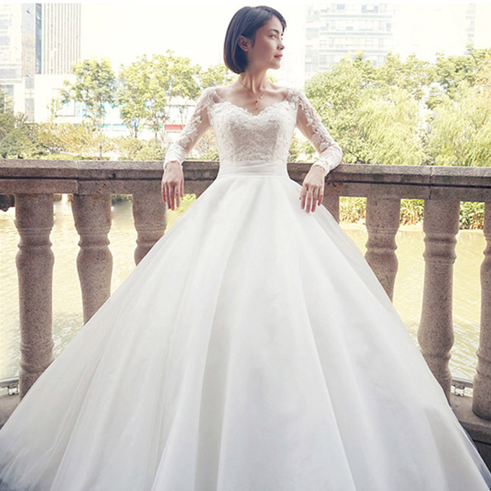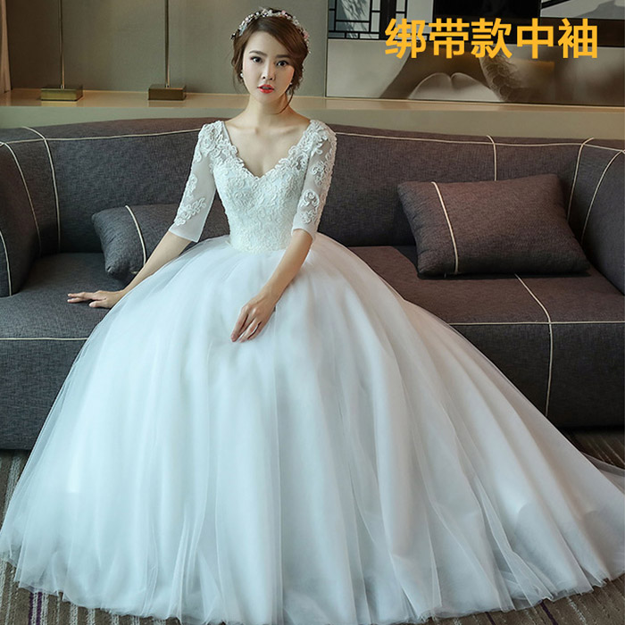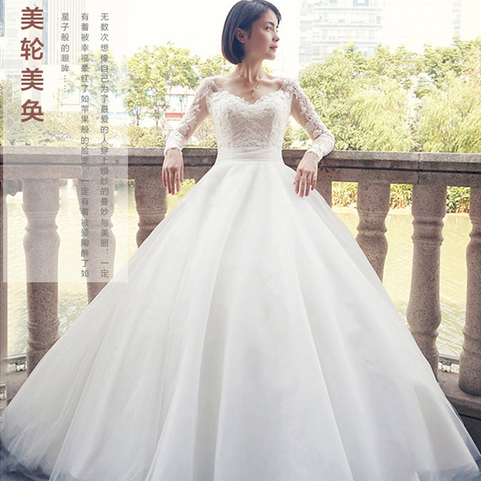 • 婚纱礼服新娘2017春新款韩式一字肩V领拖尾修身婚纱120