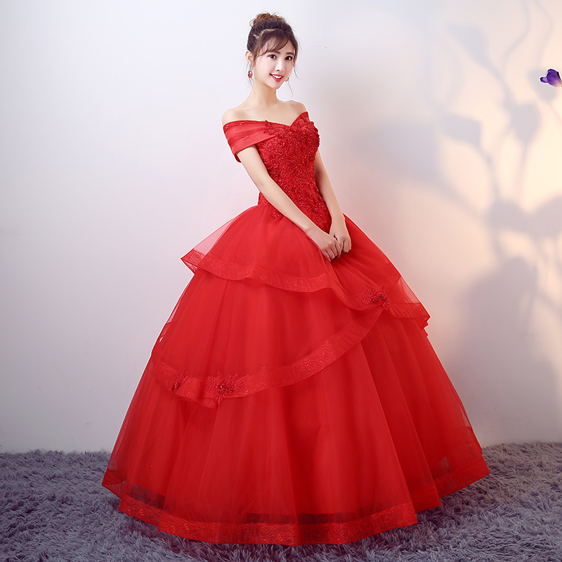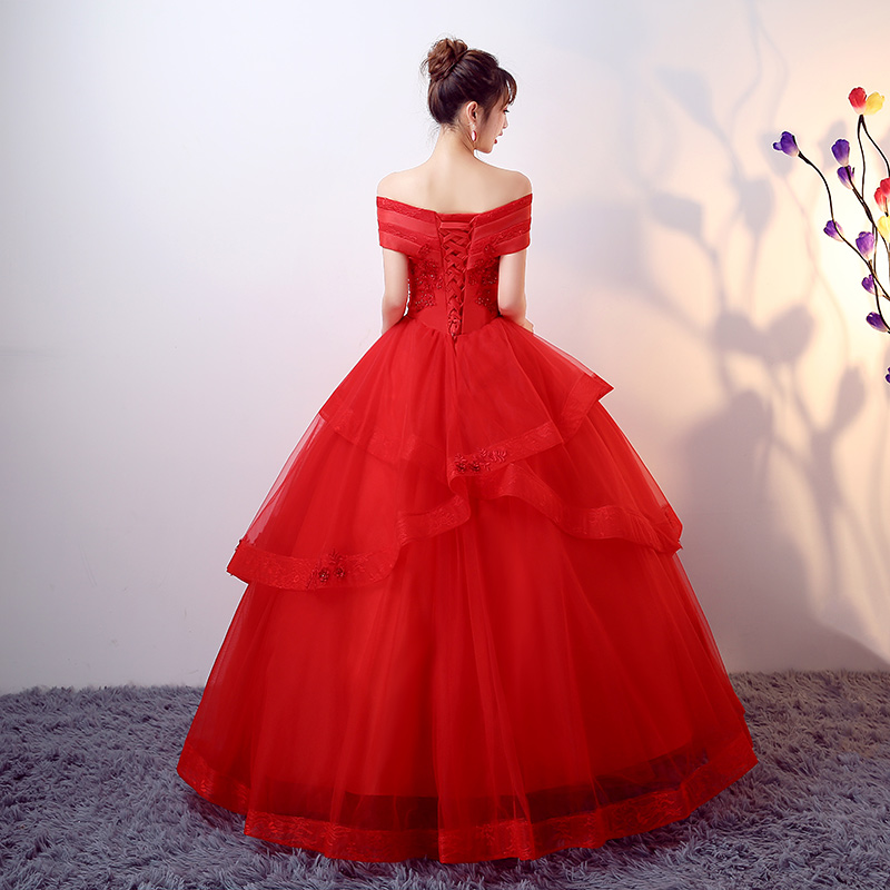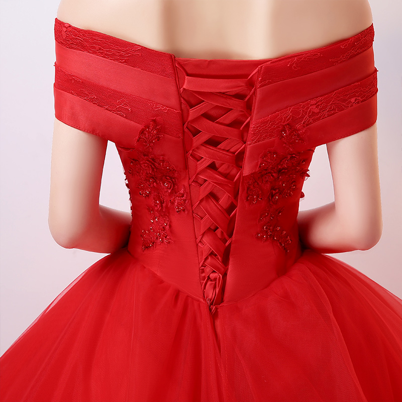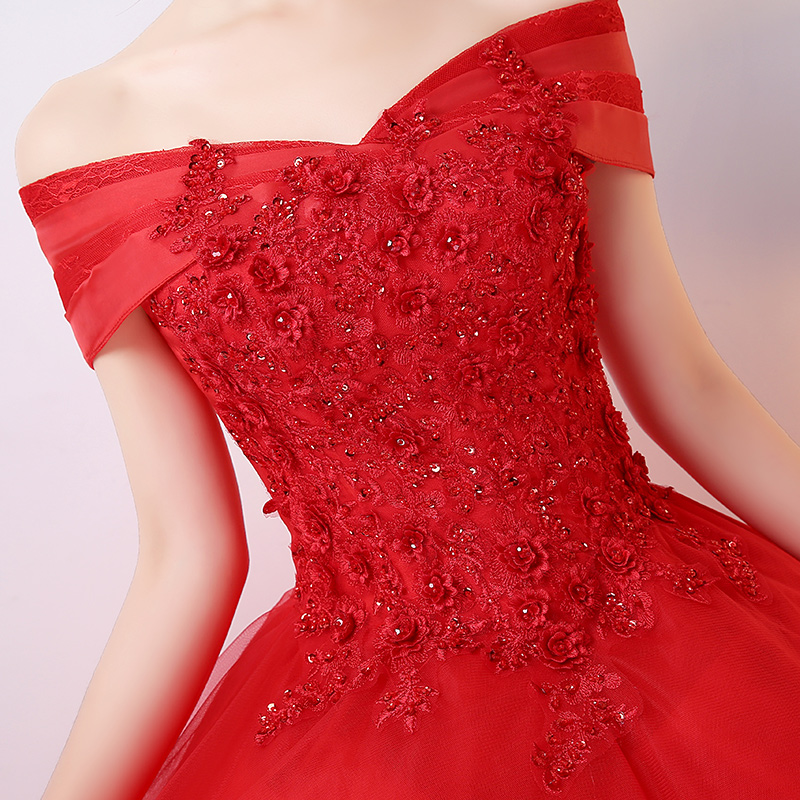 • 婚纱礼服2017新款一字肩新娘结婚韩版公主梦幻显瘦红色齐地