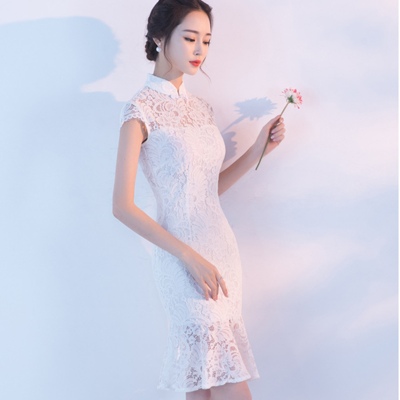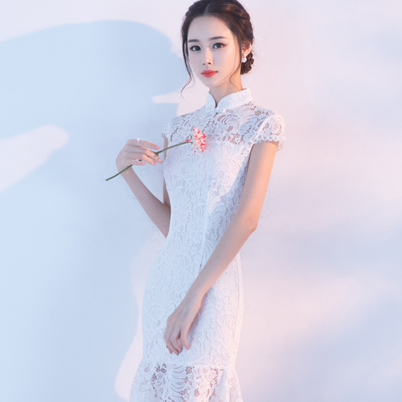 107春夏新款改良旗袍性感蕾丝小清新中式鱼尾旗袍连衣裙