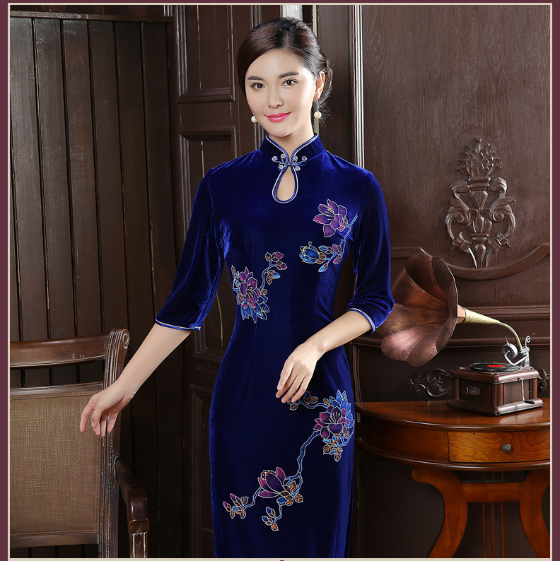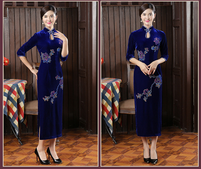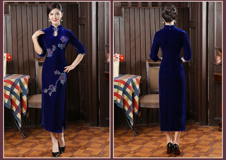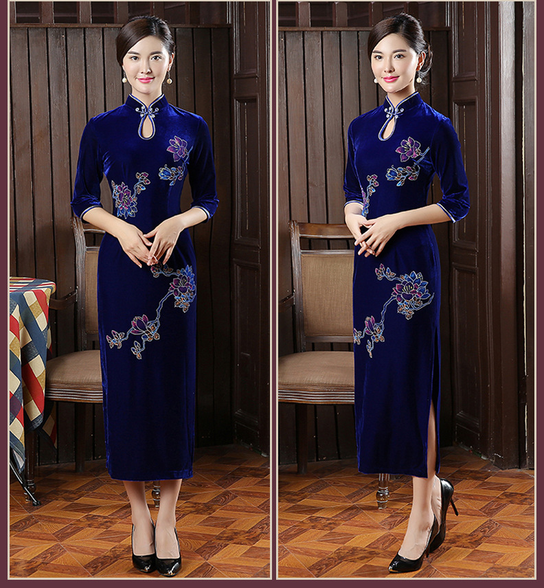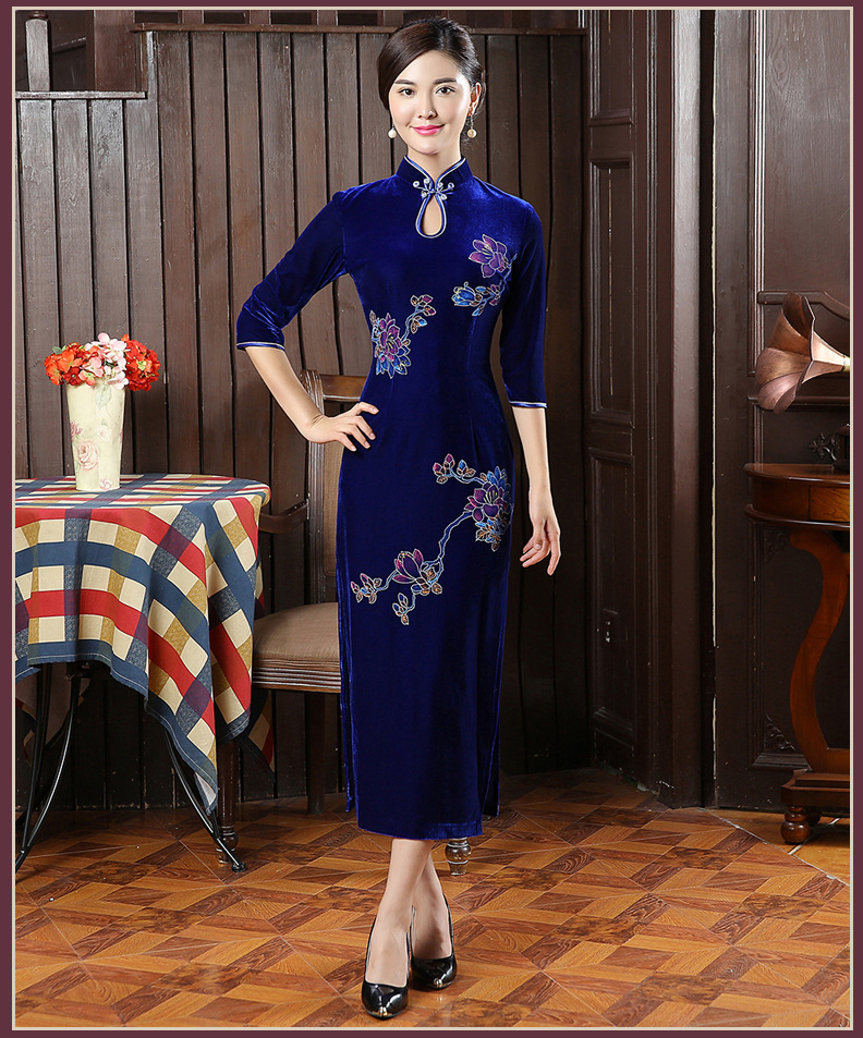时尚改良旗袍裙丝绒长款手绘旗袍女复古修身宴会新款旗袍722