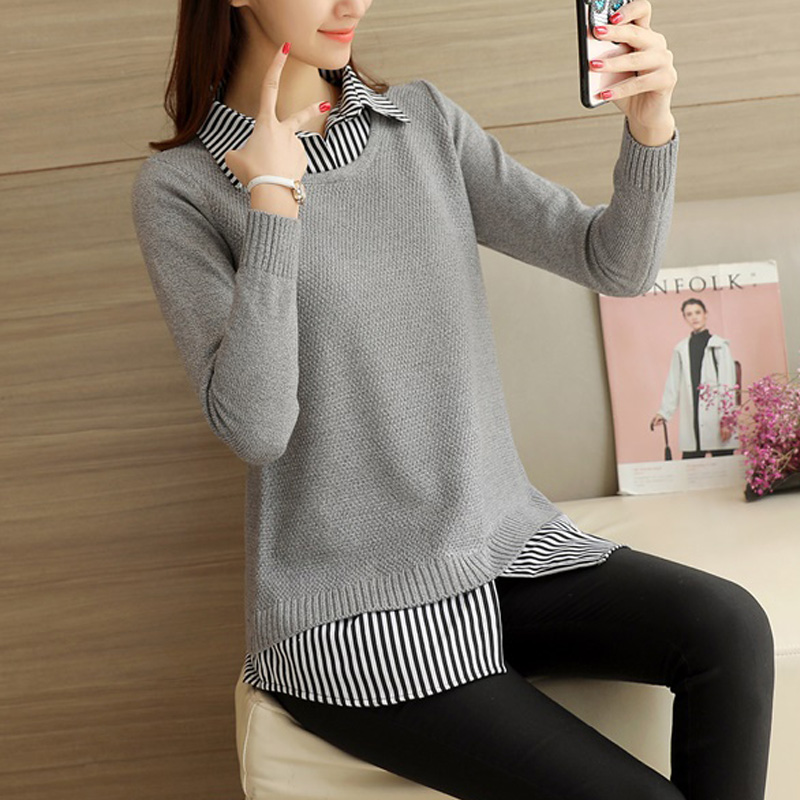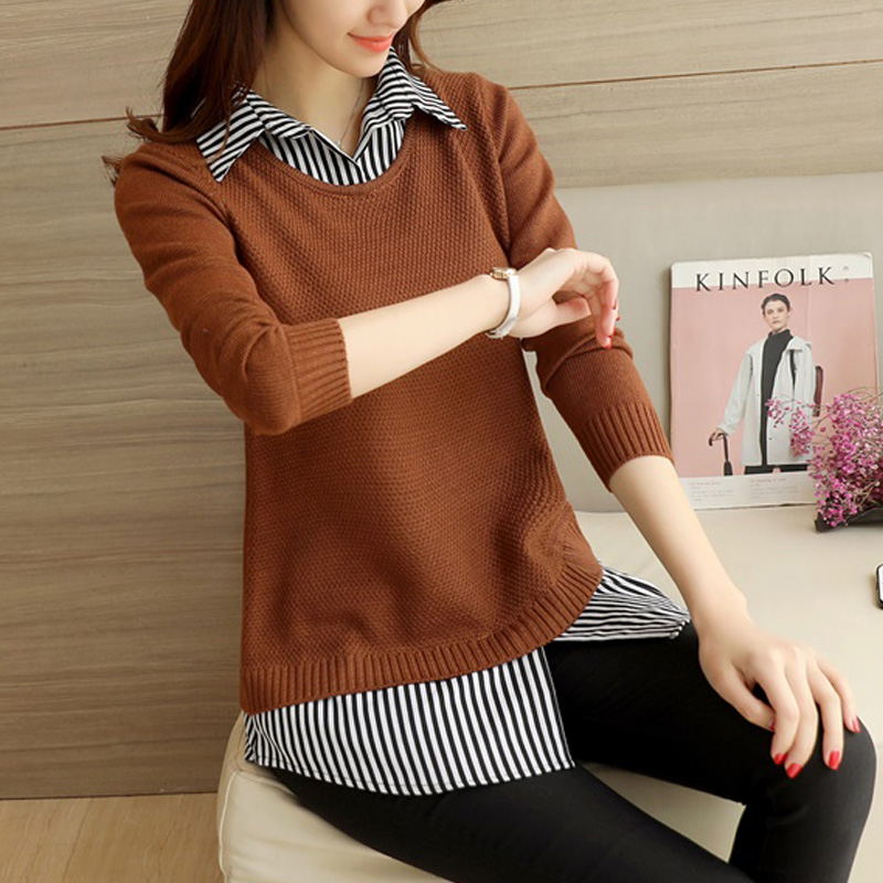 • 中长款套头毛衣女秋冬韩版宽松打底针织衫女秋装新款衬衫领假两件