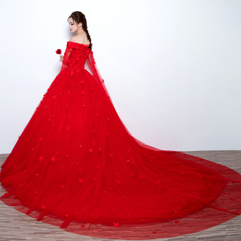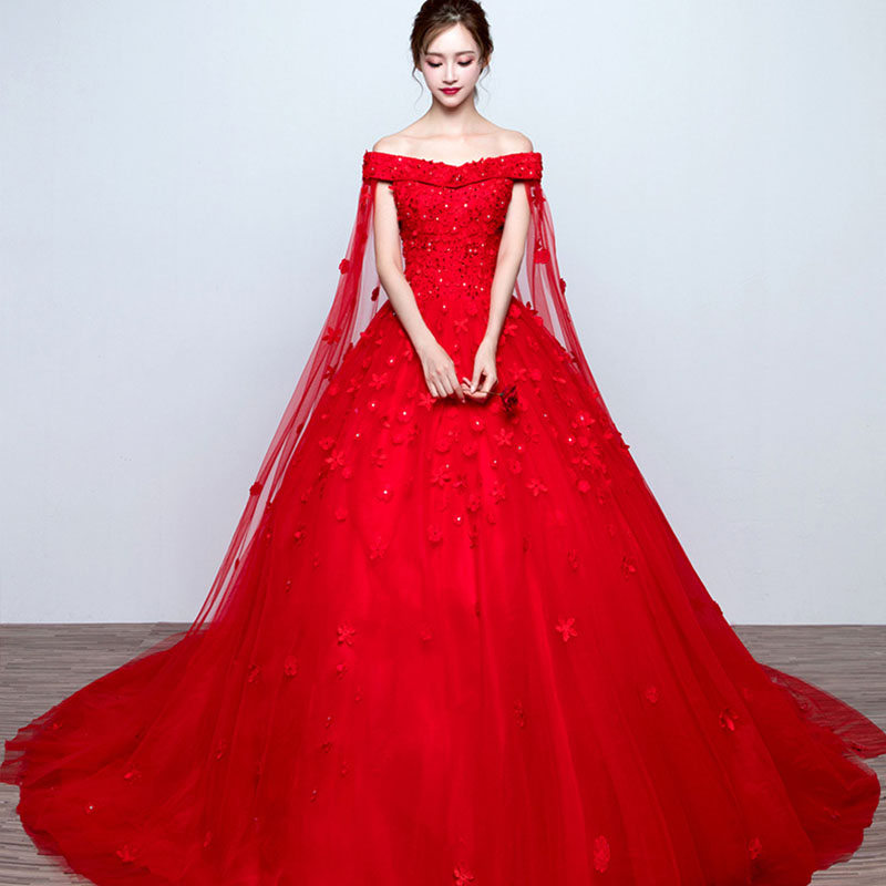 • 蕾丝一字肩结婚拖尾红色婚纱礼服新款2017秋季新娘显瘦奢华