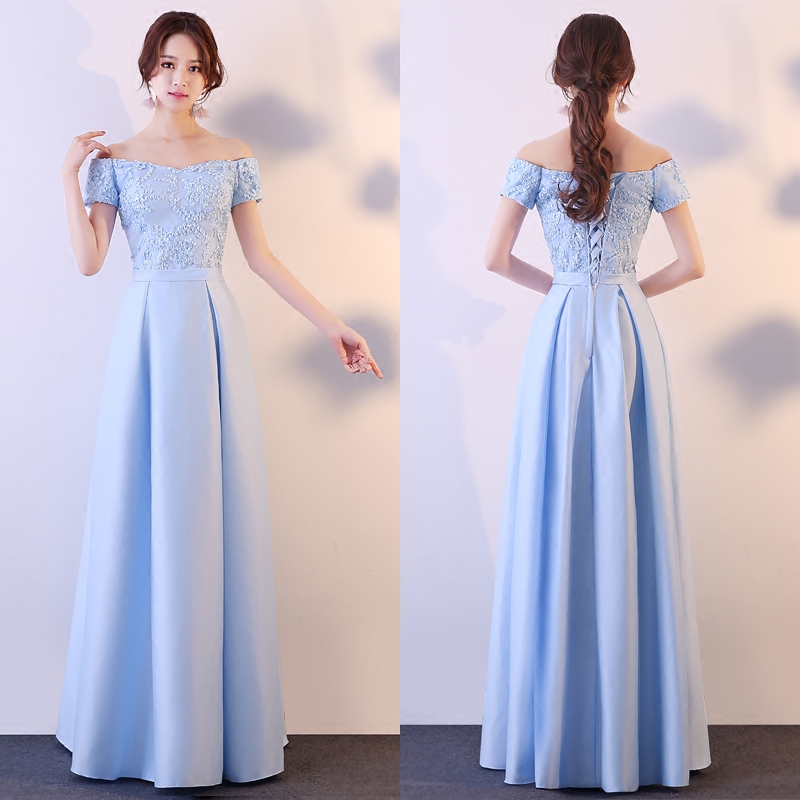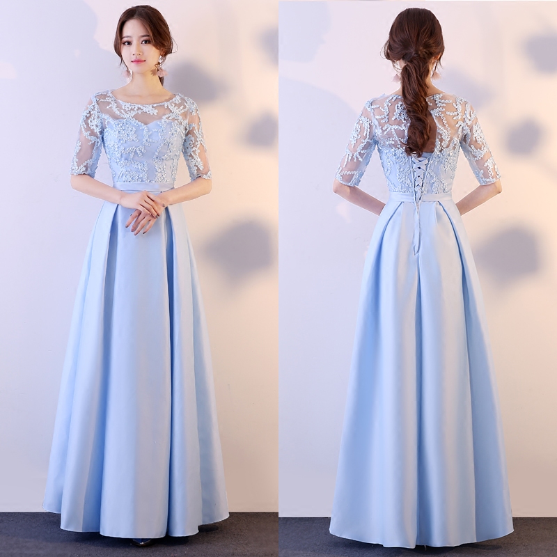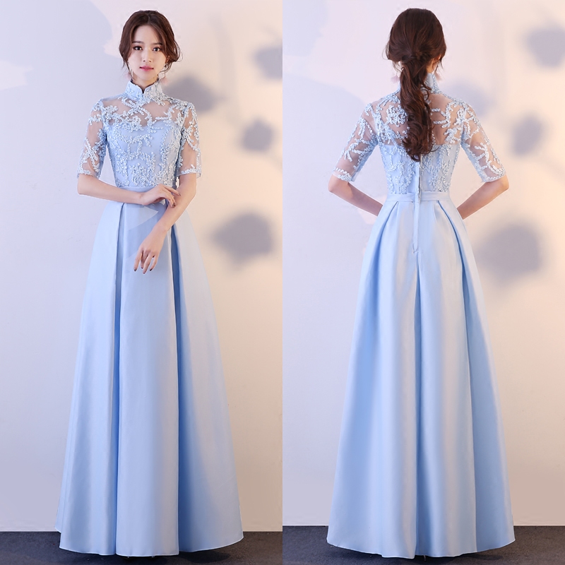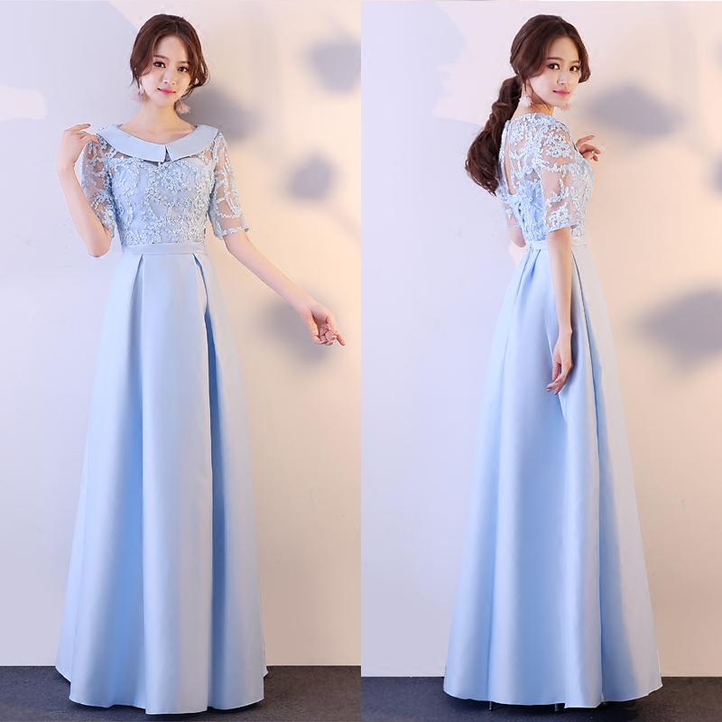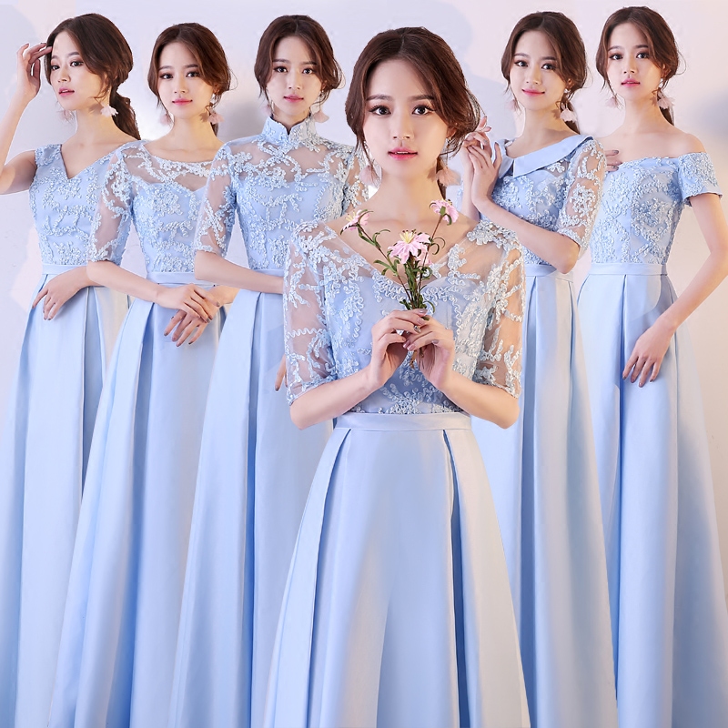 • 缎面六款可选!蓝色伴娘礼服长款冬季韩版中式伴娘团姐妹裙修身