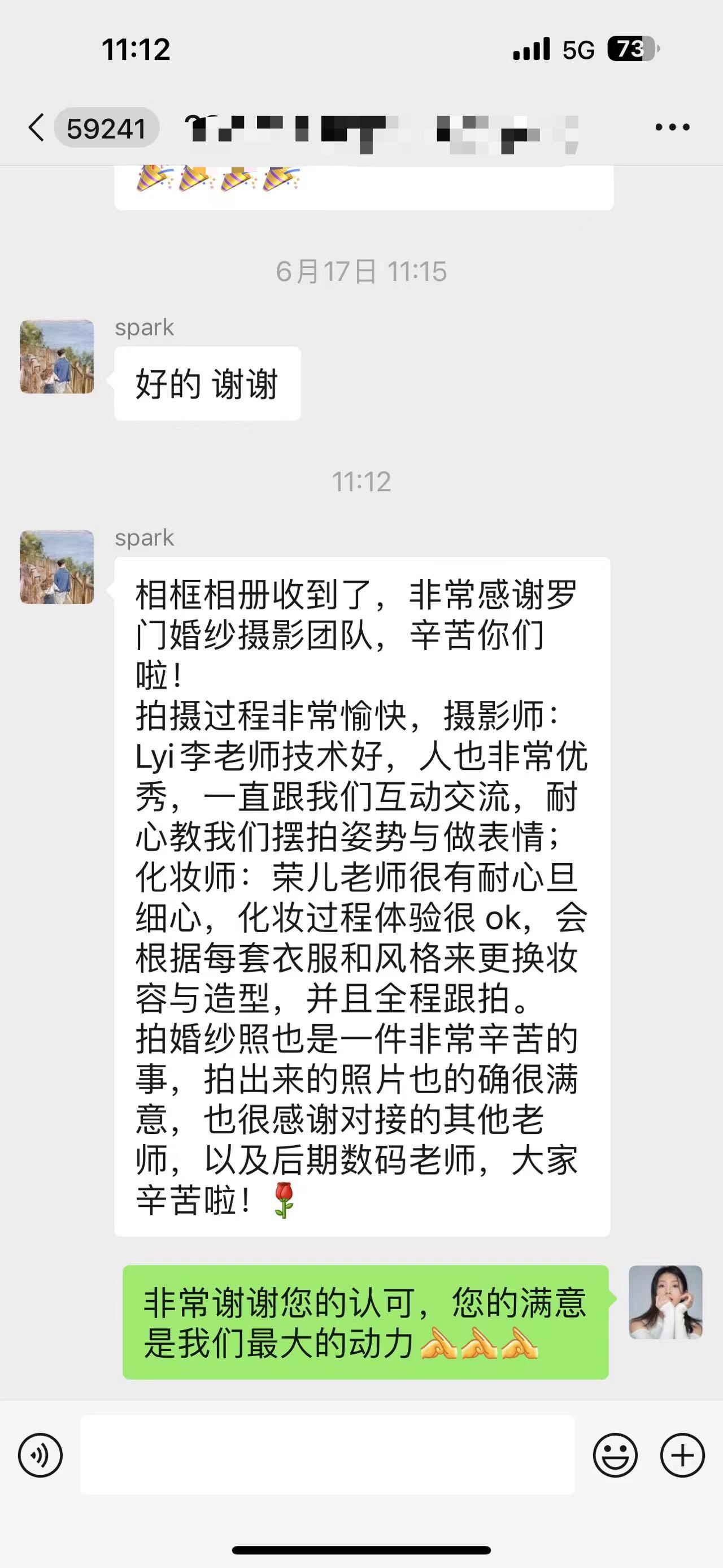 相框相册收到了,非常感谢罗门婚纱摄影团队,辛苦你们啦! 拍摄过程非常愉快,摄影师: Lyi李老师技术好,人也非常优秀,一直跟我们互动交流,耐心教我们摆拍姿势与做表情;化妆师:荣儿老师很有耐心旦细心,化妆过程体验很ok,会根据每套衣服和风格来更换妆容与造型,并且全程跟拍。 拍婚纱照也是一件非常辛苦的事,拍出来的照片也的确很满意,也很感谢对接的其他老师,以及后期数码老师,大家辛苦啦! 非常谢谢您的认可