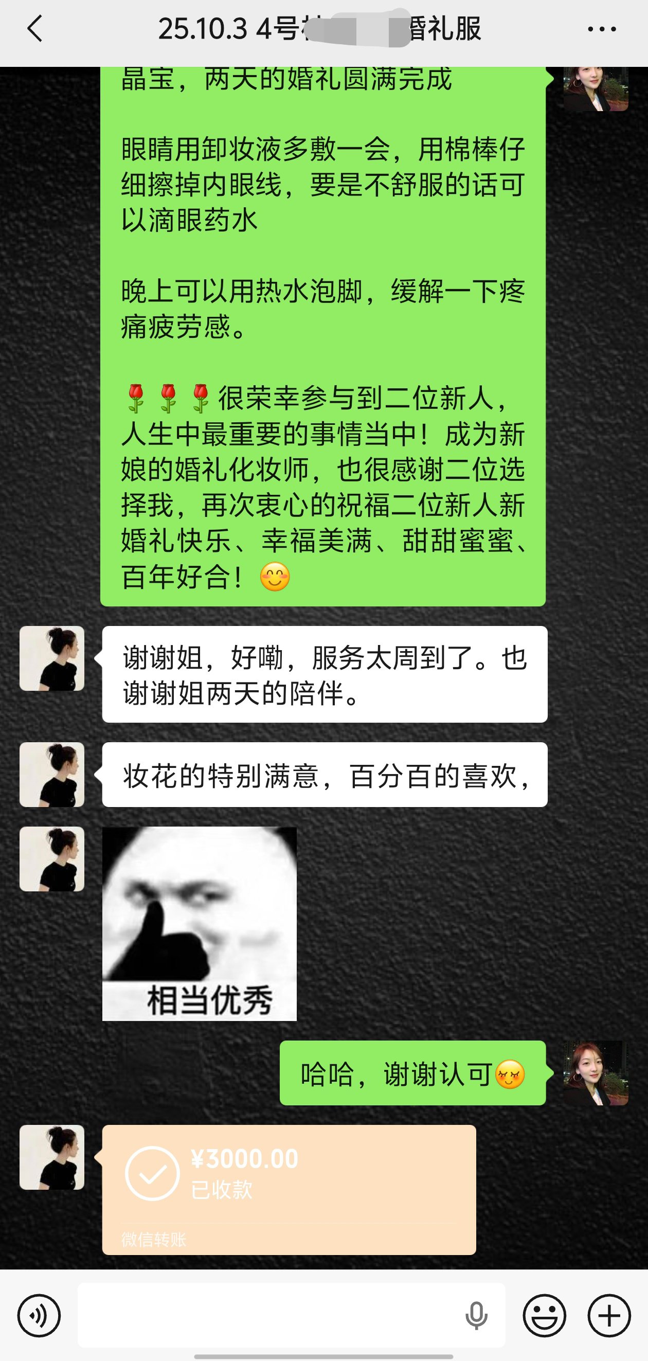 化妆师姐姐手艺超级棒,会根据顾客的需求及时调整妆容造型,每个造型做的都很好,全程很负责任,婚礼圆满完成,点赞手艺